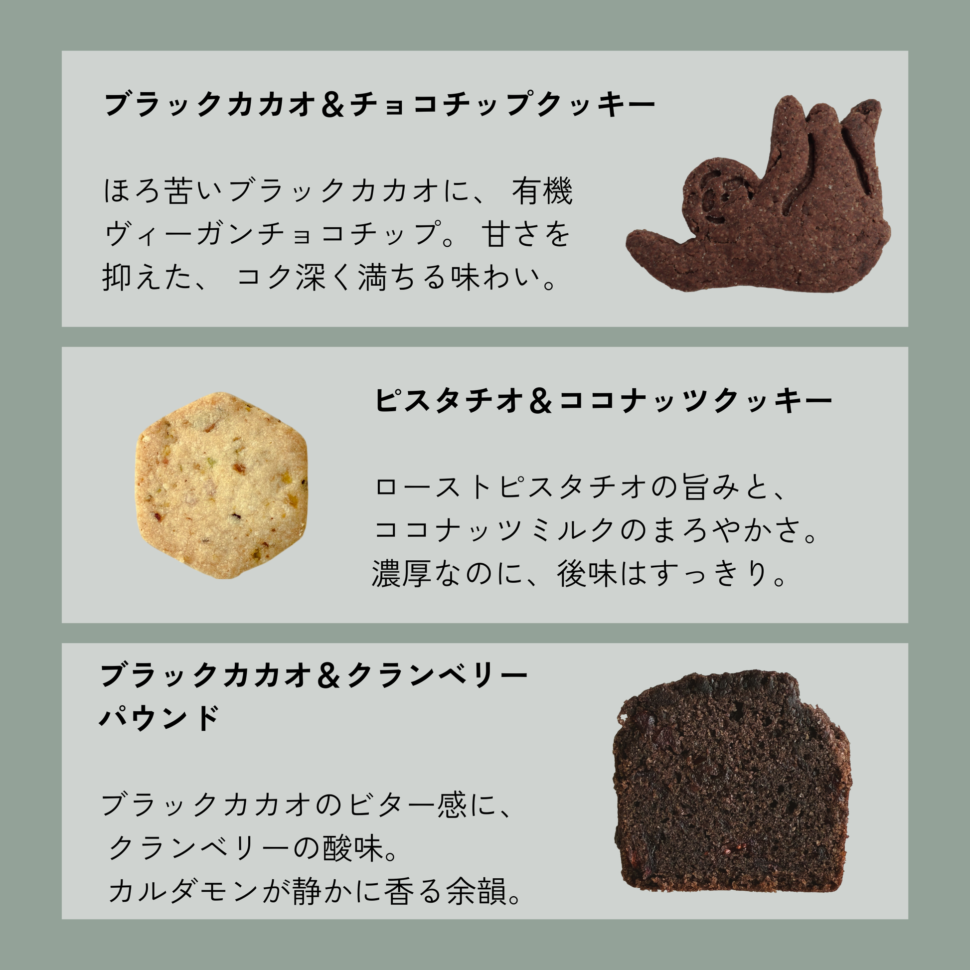 ほろ苦いブラックカカオに、有機ヴィーガンチョコチップ。甘さを抑えた、コク深く満ちる味わい。